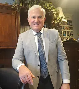 A man in a suit and tie is standing next to a chair in a room.